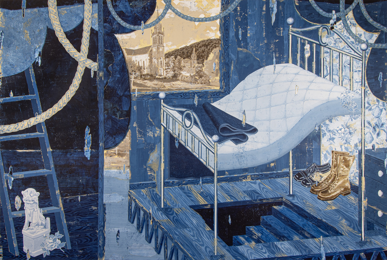 Three Seventeen AM in the Arms of Saint Dymphna acrylic, okawara on panel 60"x48", 2024